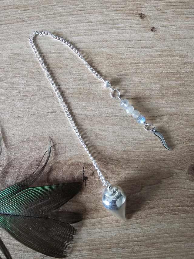 Ce pendule en goutte d’acier inoxydable, associé à une labradorite et une breloque corne de protection, est un outil de radiesthésie fiable et protecteur, idéal pour les séances énergétiques et la guidance intuitive.